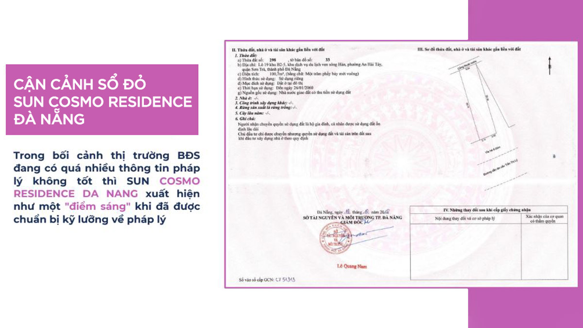 Khác với giấy chứng nhận quyền sử dụng đất tại phân khu The Panoma, giấy chứng nhận quyền sử dụng đất tại các sản phẩm nhà phố The Cosmo được ghi chú rõ ràng với nội dung “Người nhận quyền sử dụng đất là hộ gia đình, cá nhân được sử dụng đất ổn định lâu dài”. Ghi chú này thể hiện rõ ràng pháp lý sử hữu lâu dài đối với các sản phẩm nhà phố tại dự án Sun Cosmo Residence Đà Nẵng.